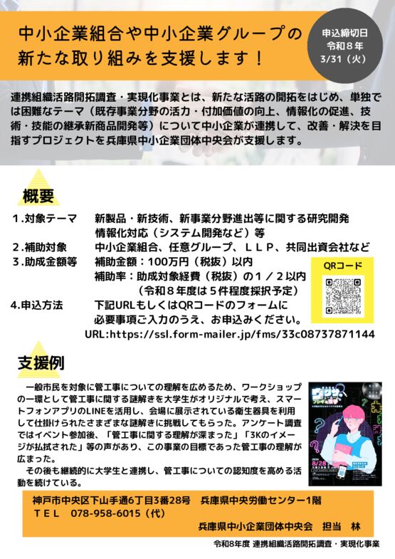 兵庫県中小企業団体中央会では、中小企業者が連携して取り組む、新たな活路の開拓や単独では困難な諸問題の解決・改善を支援します。